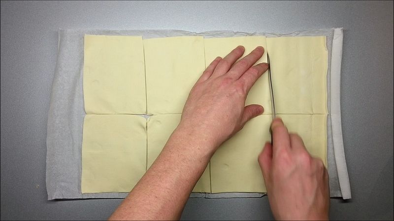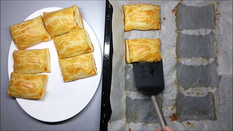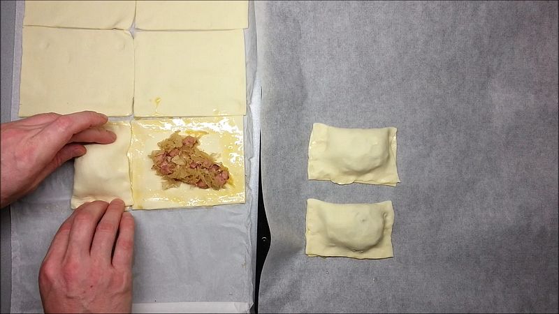 Listové těsto plníme vychladlou směsí a okraje potřeme vajíčkem. Poté okraje přimáčkneme k sobě a přendáme taštičky na pečící papír na plech.