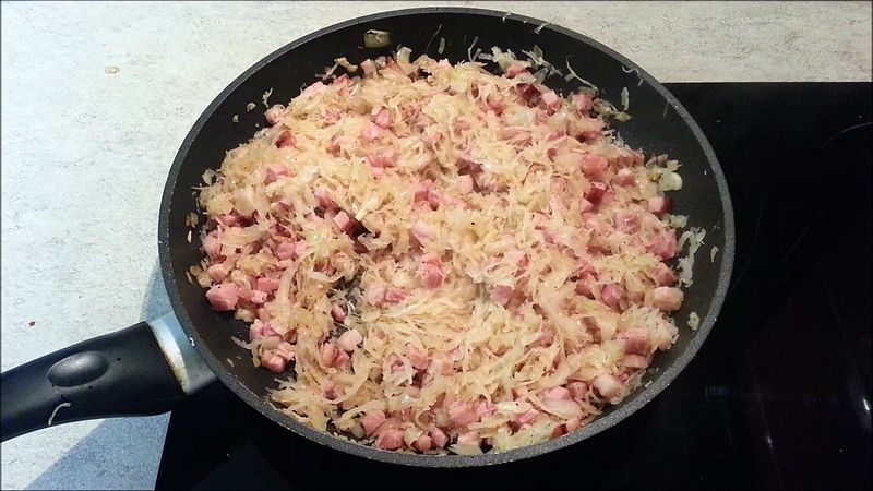 Na oleji osmažíme cibuli, poté přidáme anglickou slaninu a česneky a osmažíme. Přidáme 1/2 lžičky drceného kmínu a směs opepříme a dosolíme podle slanosti anglické slaniny.