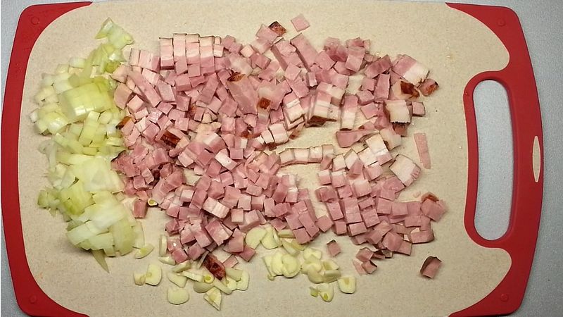 Cibuli nakrájíme najemno, anglickou slaninu na malé kostičky, dva stroužky česneku nadrobno.