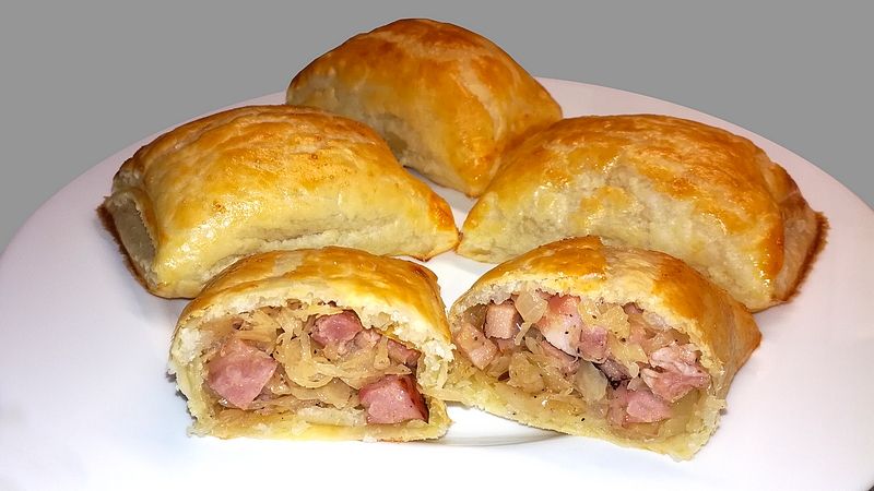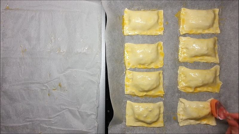 Nakonec taštičky potřeme vajíčkem z vrchní strany a pečeme v předehřáté troubě na 200 °C cca 20 minut.