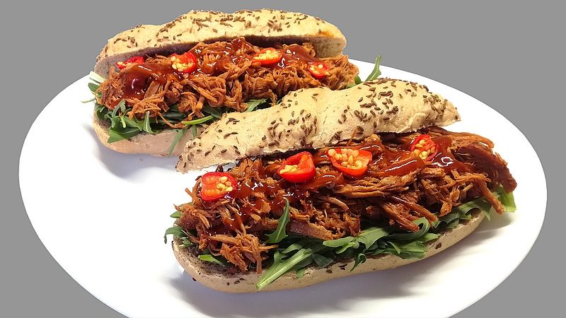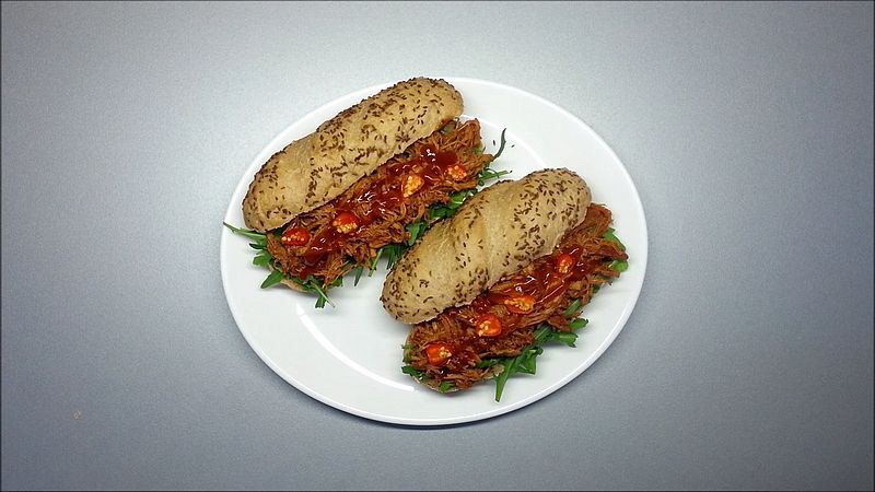 Pečené maso natrháme pomocí vidliček. Dochutíme podle vlastní chuti – sojová omáčka, sušený česnek, uzená paprika… ke šťávě z výpeku přidáme i trochu piva a pečeme nezakryté na 200 stupňů dalších 10 minut v troubě na barvu. Poté můžeme maso dávat do baget společně s barbecue omáčkou, chilli papričkou, kyselou okurkou a podobně…