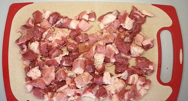 Vepřové maso nakrájíme na kostky cca 2 × 2 cm. Přidáme sůl, drcený kmín, pepř, jako když kořeníme maso na pečení a důkladně promícháme.