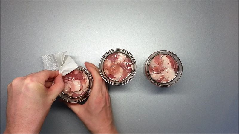 Maso plníme do sklenic 2 cm pod okraj. Nakonec do každé sklenice přidáme 2 lžíce studené vody. Důkladně otřeme hrdla a dotáhneme pevně víčka.