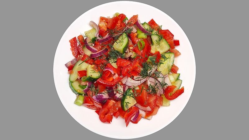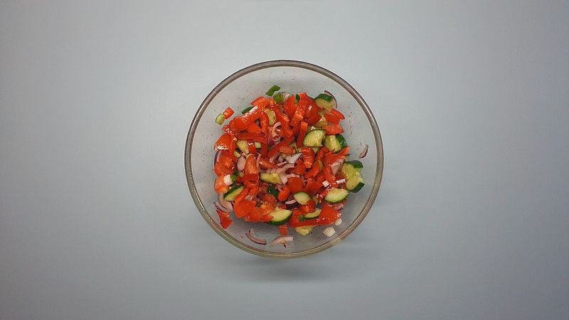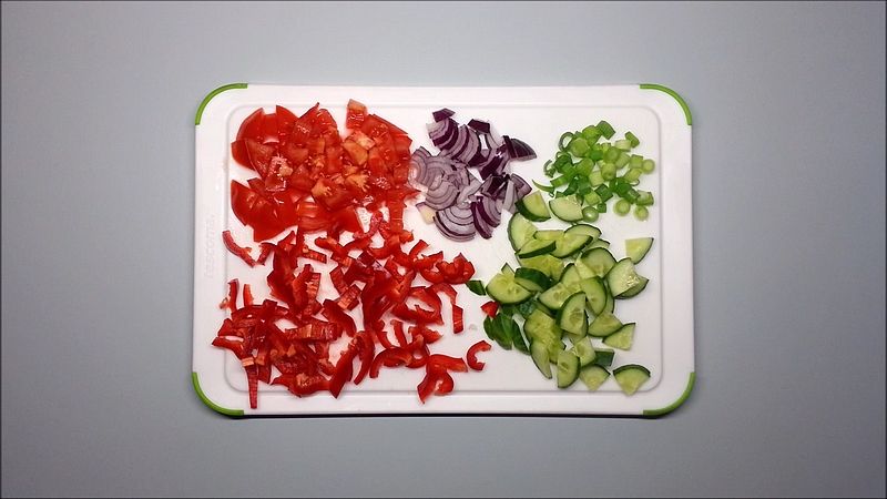 Připravíme si okurku, papriku, červenou a lahůdkovou cibulku a rajče. Vše nakrájíme.