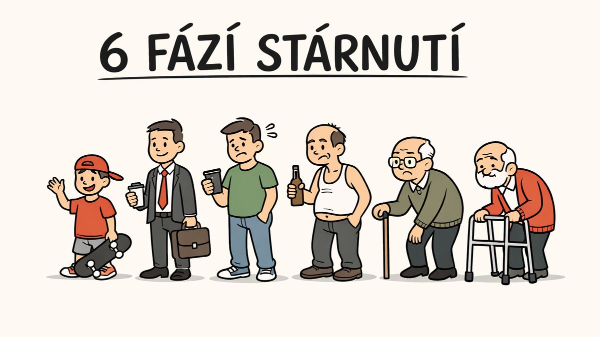 6. fáze - KONEC LADNÉHO POHYBU: Bohužel to vypadá, že 5. fáze byla jen taková kampaň na střední věk. Něco jako „Neboj se vole, takhle skvělé to bude až do padesáti.“ A pak, prásk ho! S blížící se čtyřicítkou jsem při určitých pohybech začal vrzat. Pak jsem empirickým pozorováním zjistil, že z kleku se občas dostávám do vzpřímené pozice zapřením rukou o pevný předmět - což jsem sám před sebou vnímal jako obzvlášť ponižující! No a pak začaly ty ranní trable s tahajícíma achilovkama a C3PO. Až po 10 minutách si šlachy, kvadricepsy, mezižebrení svaly a já nevím co ještě řeknou „Dobrý, už jsme toho chudáka ztrapnili dost, choď opět jako Homo Sapiens ty ubohý tvore!“ a já se mohu pohybovat volně. Když chci v noci přijít tiše domů, tak kakofonií kolen a kyčlí spustím alarm a rybičky chtějí strachem vyskakovat z akvária. Jsem jako F-16. Software je neustále inovován, ale Hardware zastarává. Na rozdíl od F-16 mi ale nikdo neumí opotřebené části přenýtovat nebo vyměnit. A to je dost na hovno. Jenže v tomhle současném rozčarování nad zlovolnou degradací tkání si říkám, že další fáze asi budou KONEC VLASŮ, KONEC PŘITAŽLIVOSTI, KONEC VLÁDY NAD MOČOVOU TRUBICÍ a další nehezké konce, takže mám být ve výsledku rád, že 10 let po konci života jen vržu a tiše doufat, že ty další konce na mě ještě chvilku počkají.