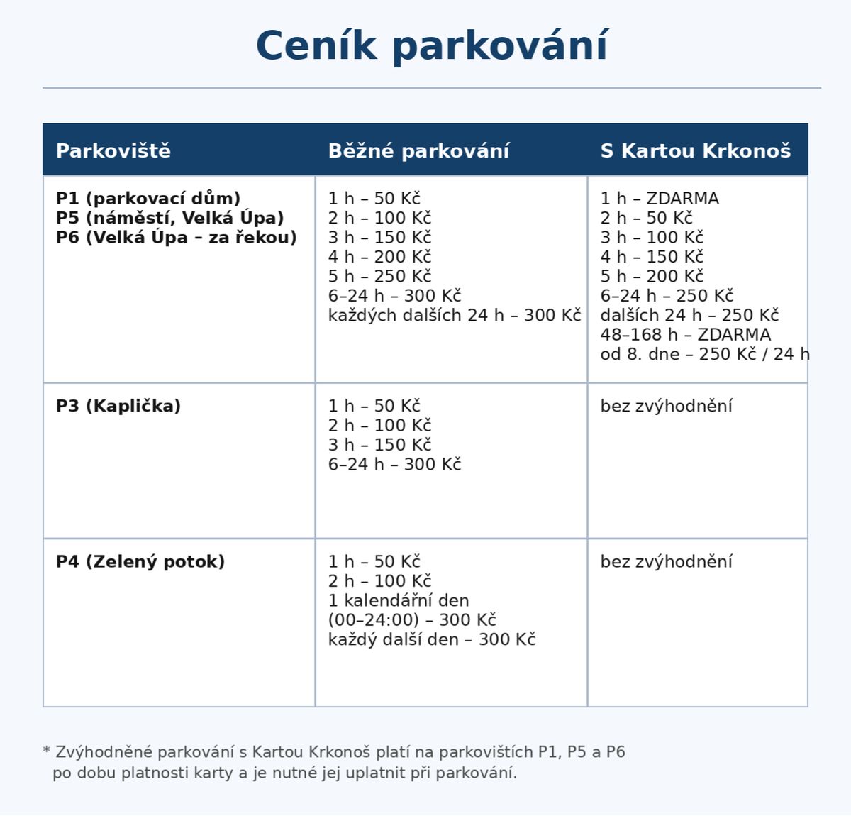 Zvýhodněné parkování pak mohou využít držitelé Karty Krkonoš, kterou hosté získají zdarma u svého ubytovatele.