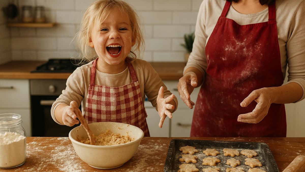 Pečení s dětmi je jedna z těch činností, kterou v reklamách zobrazují jako idylické rodinné dejavú: matka v krásné zástěře, děti se smějí, mouka se jemně vznáší vzduchem, kamera se romanticky třese, protože všechno je prostě tak dojemné.