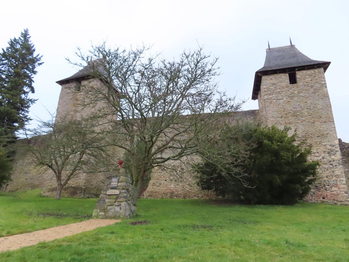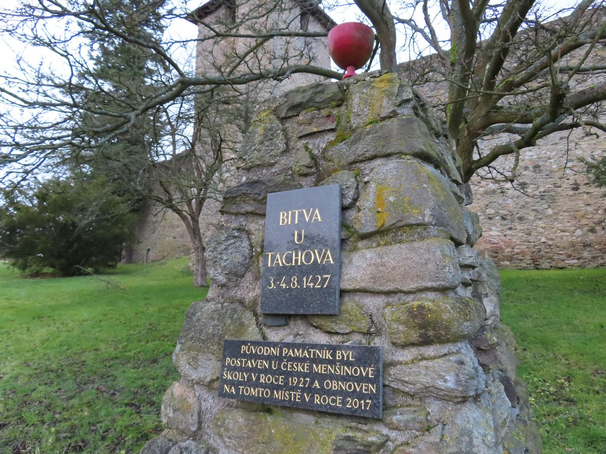 Jiná taková ulička z náměstí nás přivede k městským hradbám. Po překřížení Husitské ulice už můžeme tušit, že se blížíme k místu spojenému s bitvou, o níž titulek tvrdí, že k ní možná ani nedošlo. Na zatravněném prostranství už vně městských historických hradeb, tedy pod nimi z venkovní strany odvrácené od historického jádra, stojí mezi dvojicí obranných věží skromný památník z kamenných hrubě opracovaných kvádrů. A na jeho vrcholu červeně nabarvený kalich jako symbol kališnické víry, ve srovnání s podstavcem mírně poddimenzovaný. Pamětní deska informuje, že sem byl přenesen z jiného místa ve městě, takže teoreticky vzato se ta bitva s křižáky měla odehrát dne 4. srpna 1427 úplně někde jinde. Přesněji řečeno na kopci nad Tachovem v lokalitě, kde stojí památník bitvy monumentálnější z roku 1971, ale ten není v příliš dobrém technickém stavu. Z prostoru od hradeb a zámku to místo poznáte podle moderní rozhledny, kterou tam před několika lety postavili a jež se těší jako veřejně přístupná také velkému zájmu návštěvníků.