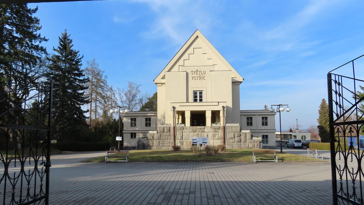 Pohřební hosté se do smuteční síně s kremací dostávají po masivním kamenném schodišti