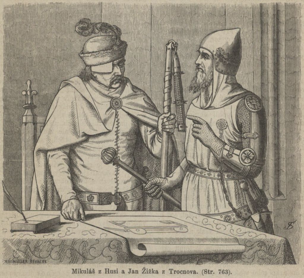 Rozhovor Jana Žižky na levé straně obrazu s Mikulášem z Husi byl publikován v Česko-moravské kronice v roce 1868, Foto: Wikimedia Commons / volné dílo