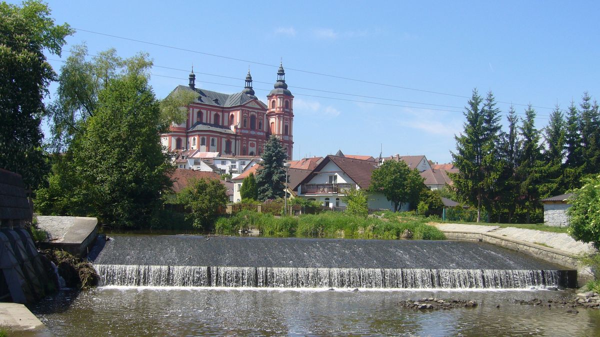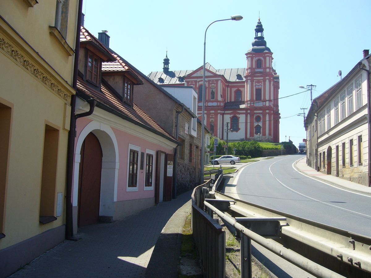 Rodný dům architekta Hlávky se nachází na snímku zleva pod stoupáním silnice k baroknímu kostelu