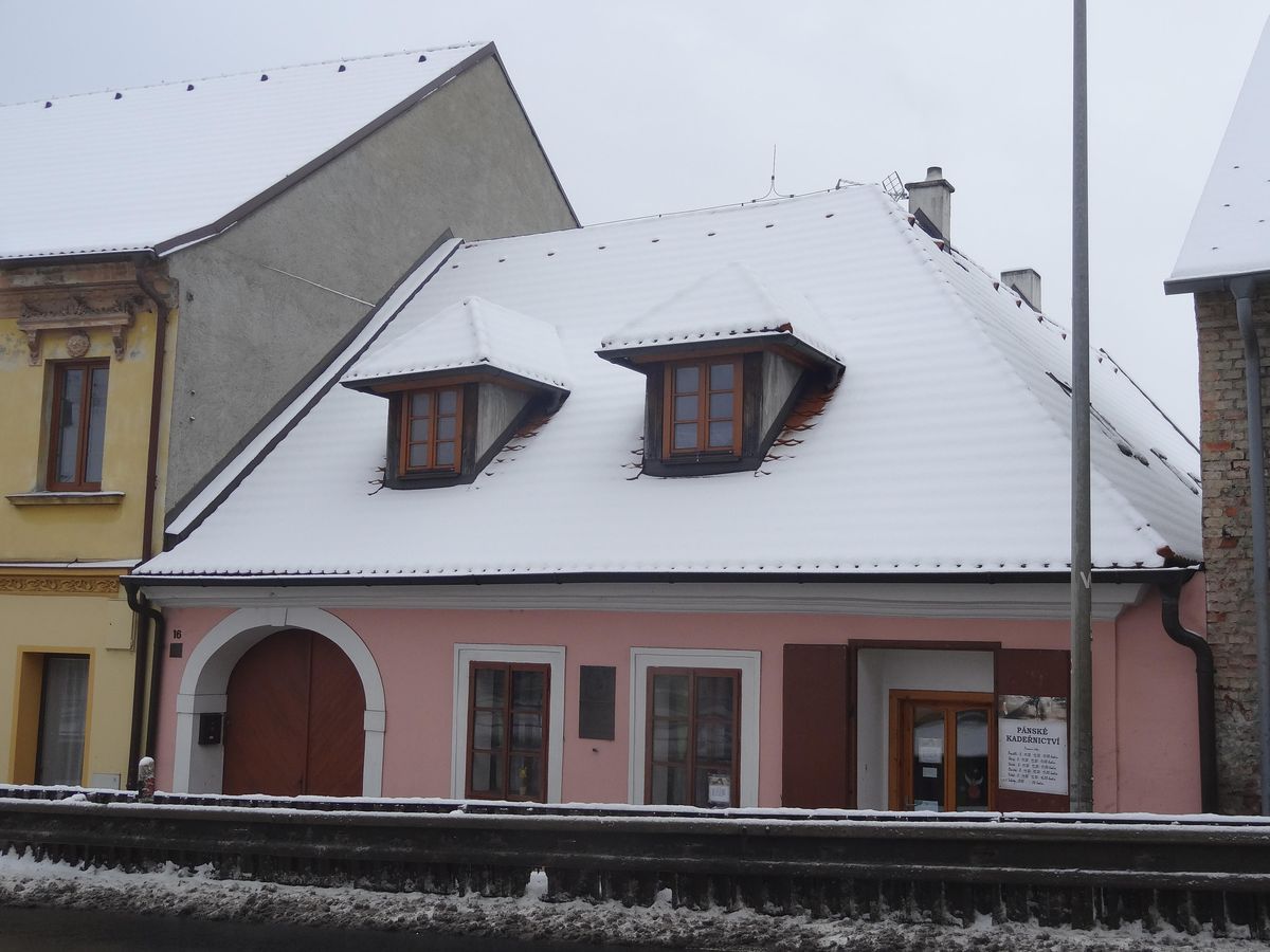 Čelní pohled na rodný dům s pamětní deskou hned vedle frekventované silnice za přeštickým náměstím