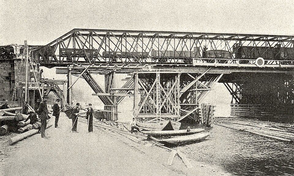 Pohled na původní příhradový most s rovnoběžným horním pásem těsně před tím, než bude nahrazen novou konstrukcí z roku 1901, Foto: Wikimedia Commons / volné dílo