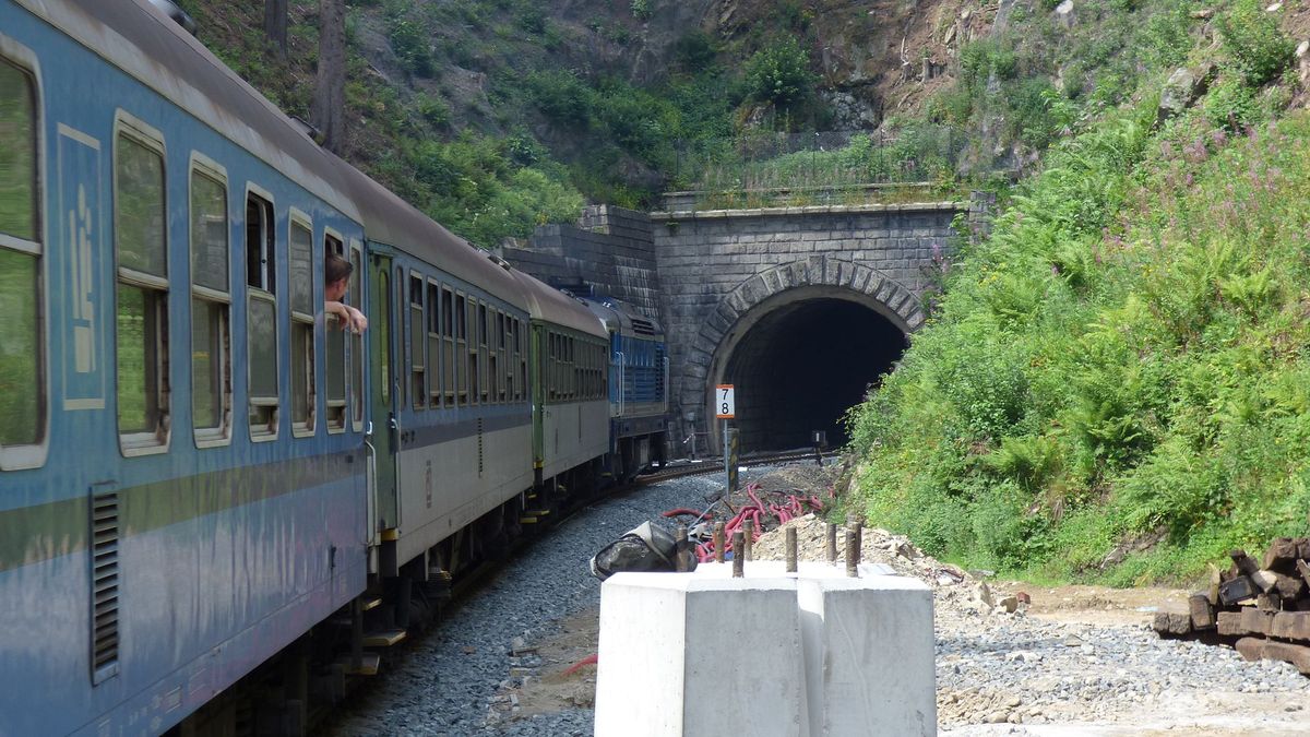 Výjezd vlaku z tunelu do stanice Špičák, svého času byl nejdelším u nás a při jeho stavbě zahynulo mnoho zahraničních dělníků - barabů.