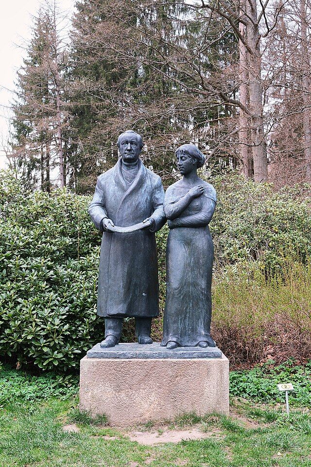 Socha s názvem Goethe a Múza v Mariánských Lázních, kde Múzu nepřekvapivě představuje Ulrika von Levetzow, Foto: Wikimedia Commons / volné dílo
