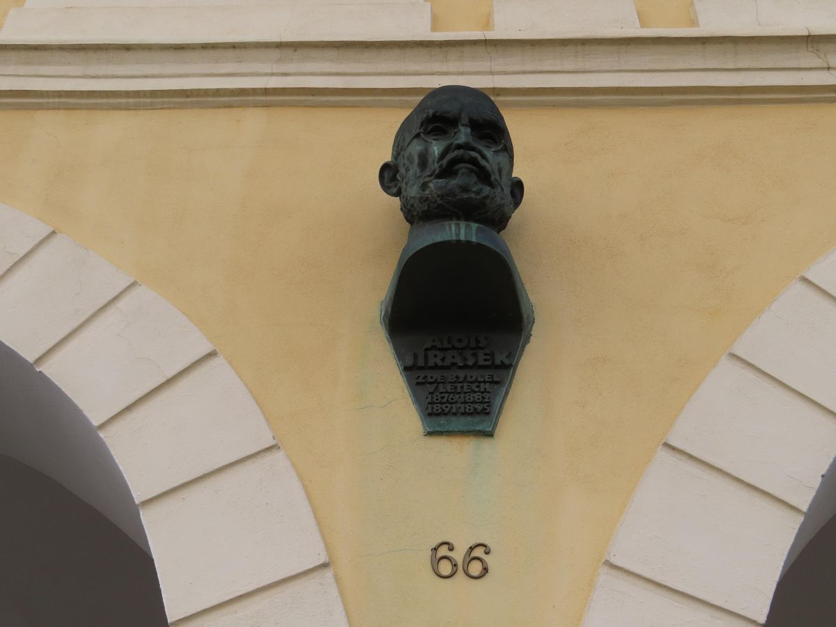 Připomínka historika a autora mnoha románů o českých dějinách Aloise Jiráska, který v Domažlicích nikdy trvale nebydlel, ale často sem jezdil