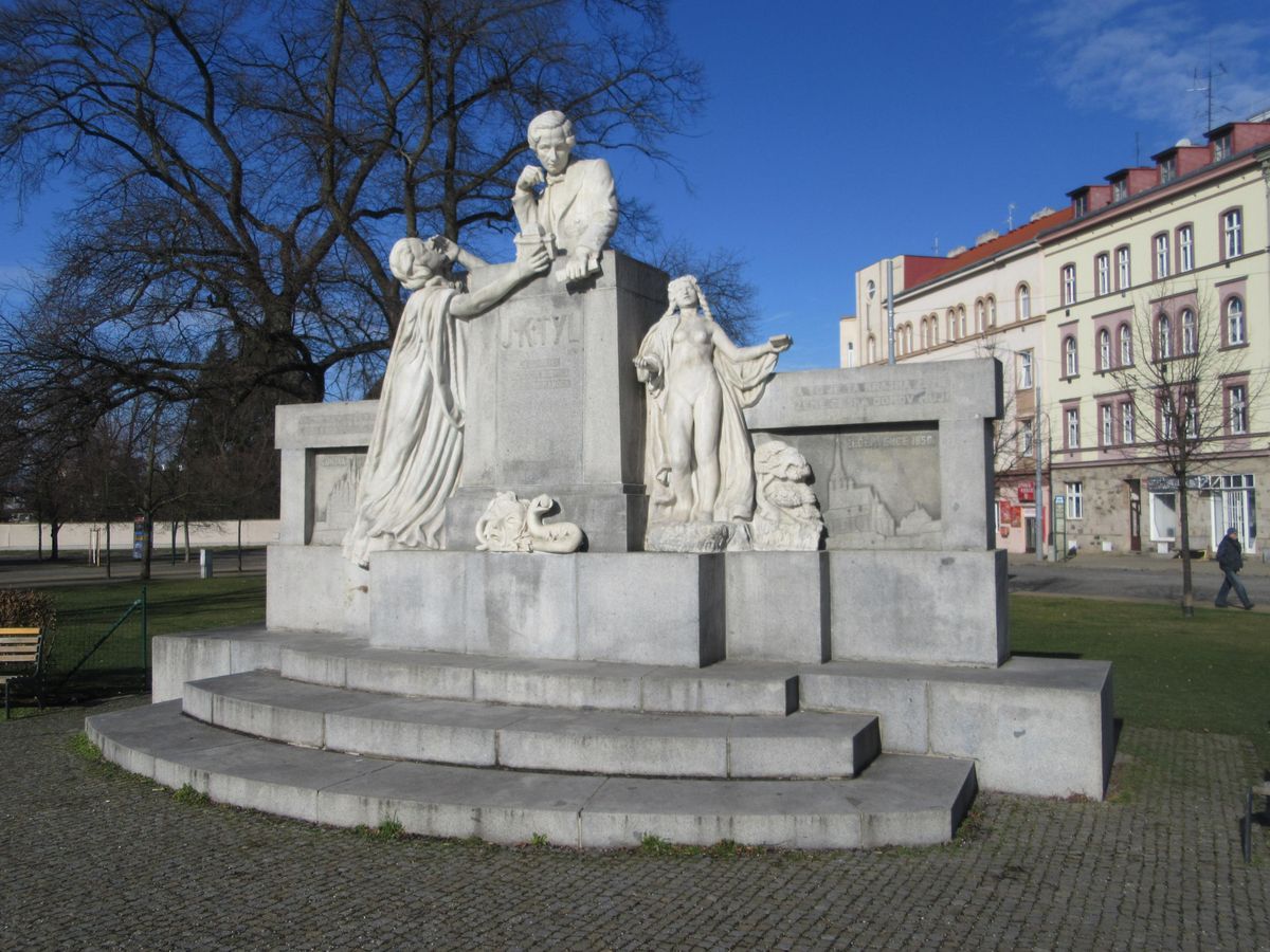 Celkový pohled na památník na Mikulášském náměstí, za zdí z levé strany od něj byl J.K.T. na hřbitově pochován