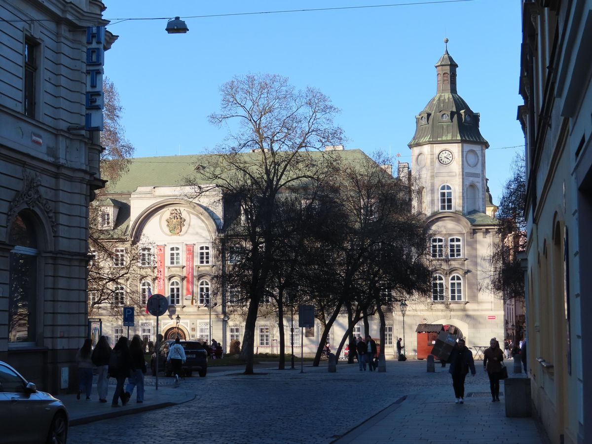 Pohled od hotelu směrem k Brance, vybudované z původní Litické brány, a sousední knihovně, kde dříve na gymnáziu studoval Bedřich Smetana