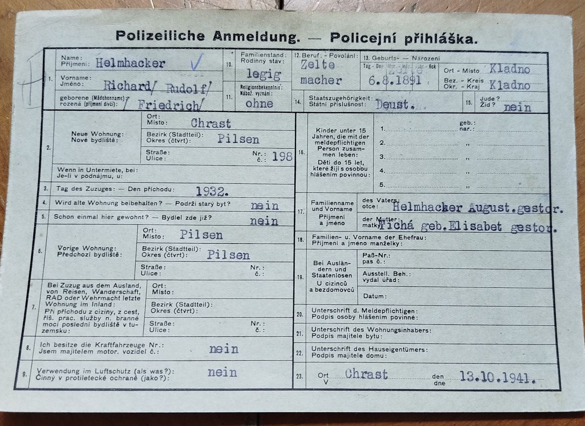 Ke všemu si znepřátelil mnoho lidu z Chrástu svým podivínským chováním. Domnívala jsem se, že až bude po válce a odstěhuji se od Helmhackera, že nebudu nucena ve lžích s vedoucími německými osobnostmi pokračovat. Za celou dobu, kdy Helmhacker nastoupil vojenskou službu, to je od 25.6.1944, jsem já sama proti nikomu nic nepodnikala, starala jsem se pouze o opatřování svojí zahrádky a domácí práce. Kromě toho jsem opatřovala textilie pro své známé.”