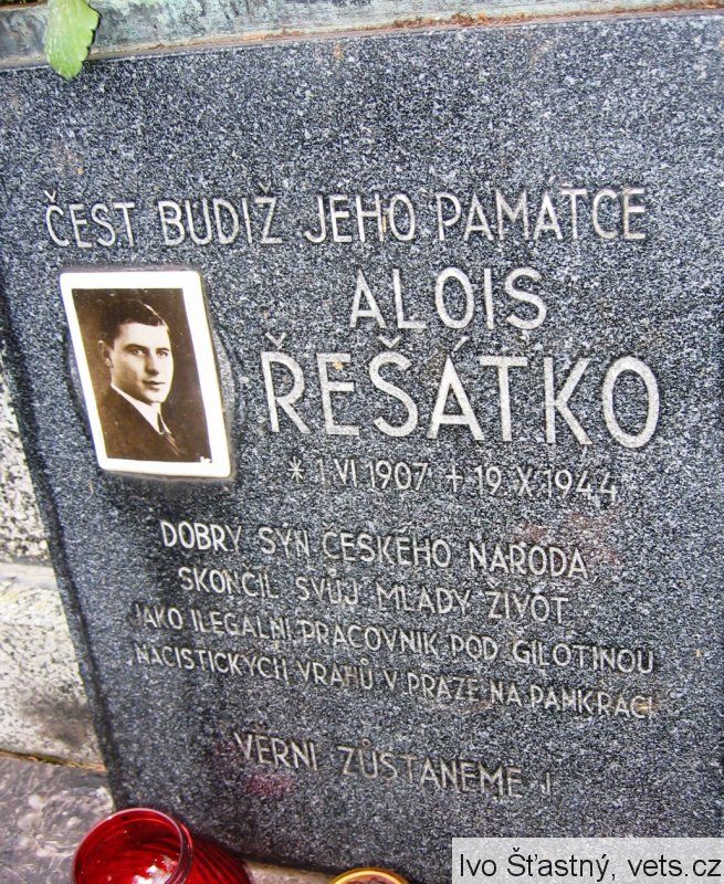 Alois Řešátko, narozen 1. 6. 1907 v Hořovicích, byl popraven v Praze 19. 10. 1944 za přechovávání osob nepřátelských říši.