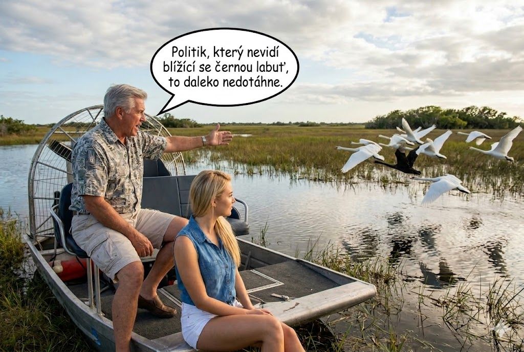 Ve floridském Everglades National Park se teorie černé labutě vysvětluje nejlépe. Popisuje důležité neočekávané události, které mají významný dopad na společnost. Tyto události se odchylují od toho, co je běžné, a proto je obtížné je předvídat.