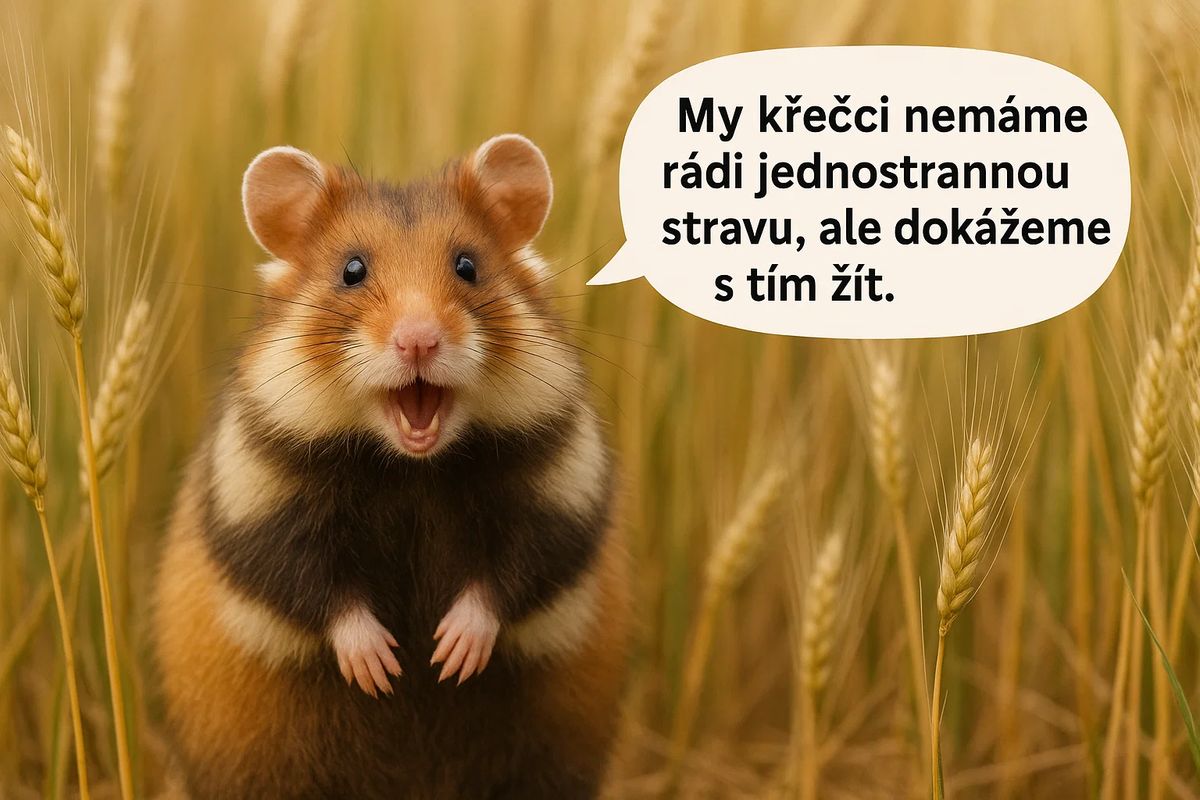 Mluvící křeček August má zdravý názor na potravu – lán ječmene je v křeččím světě maximum možného. Jen mu nevyhovuje genetické zkracování stébla, protože jsou křečci více na ráně sokolům.