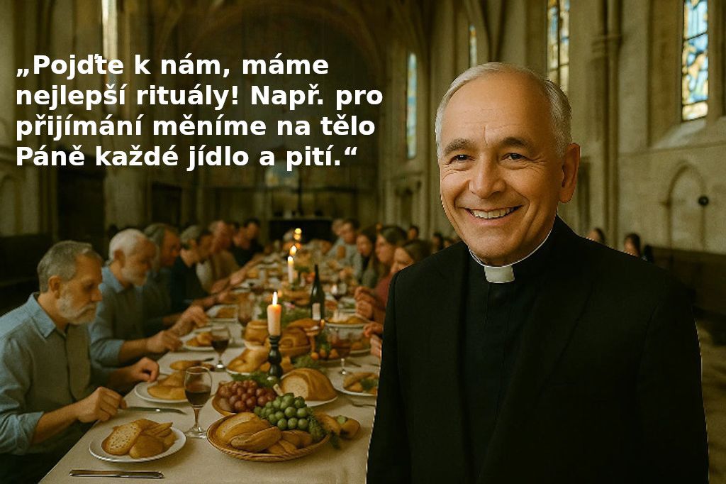 Lachlan Mackay, biskup církve Pravdivého slova, umí ve svém kostele vytvořit bohulibou družnou atmosféru, tak podobnou poslední večeři Páně, jen více veselou. Pán Bůh budiž pochválen!