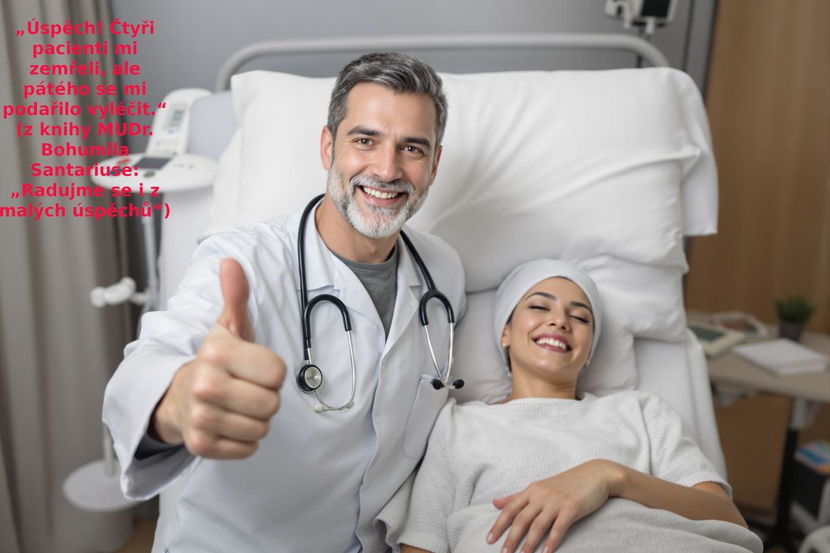 Doktor Santarius je hrdý na svůj tak zřídkavý úspěch, že vyléčil pacientku. Přejme mu jeho štěstí - ale raději se mu v nemocnici vyhněme). (Kdo má úspěch jen málokdy, má z něj o to větší radost.)