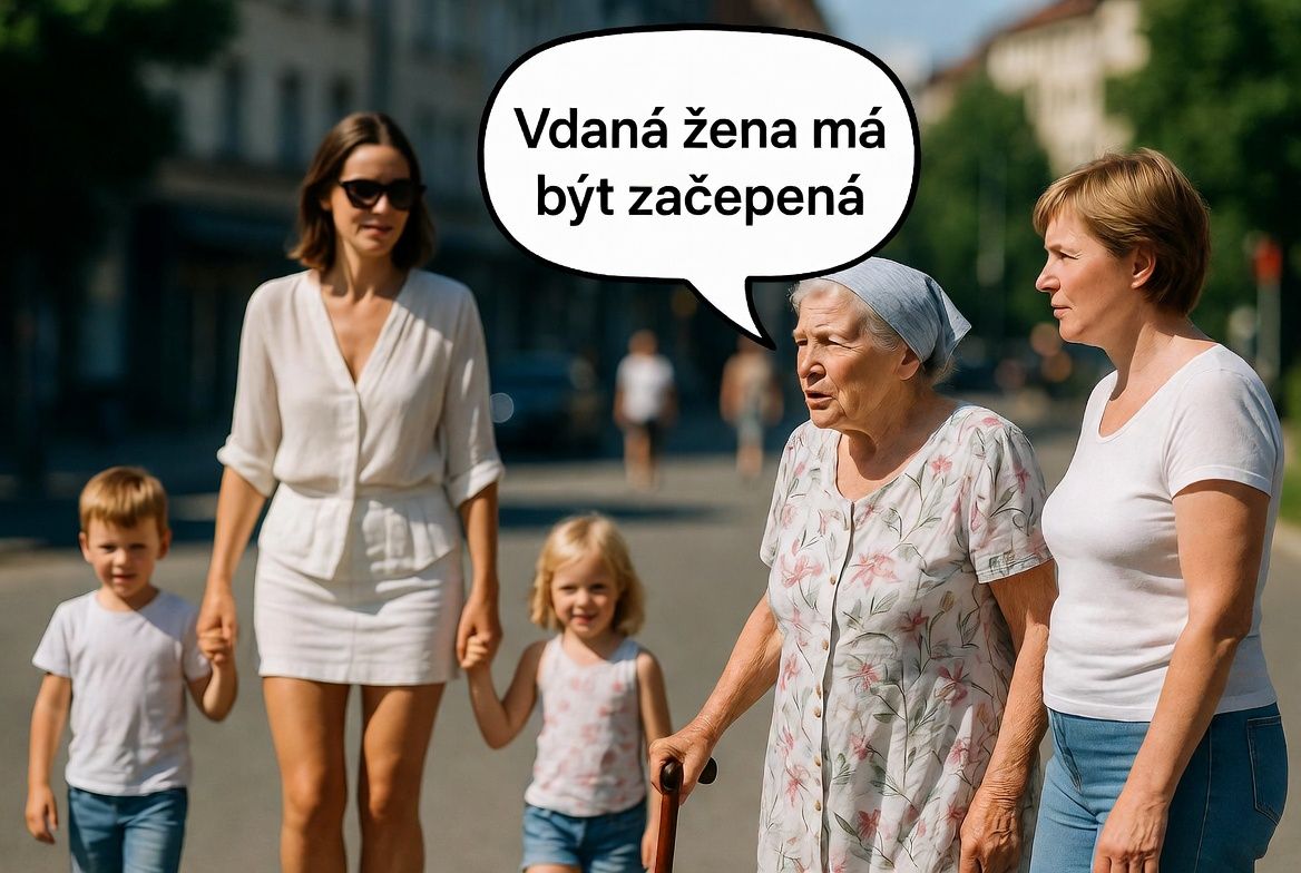 Babička Hromadová se mračí při pohledu na polonahou sousedku. Není to správné až tak šetřit na oblečení. (A možná i na spodním prádle!) https://apolach.cz/?p=1451