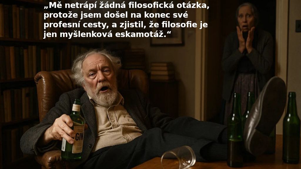Tak už skončilo mnoho filosofů. Nyní přišla řada k prohlédnutí na filosofa Michaila Bradberry-Corka. Nešťastný myslitel si naštěstí jako vedoucí katedry filosofie vydělal dost, aby se mohl kvalitně opít a na chvíli zahnat splín.
