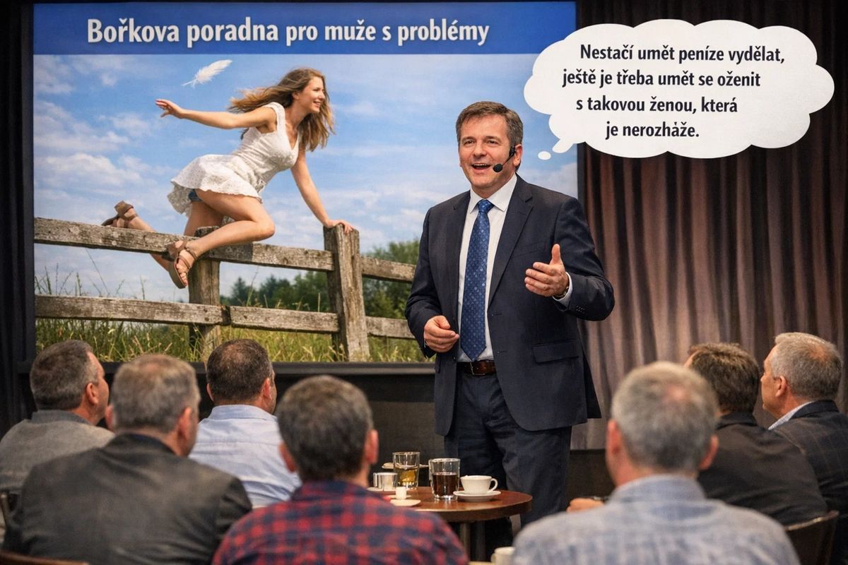 Bořek z Bořkovy poradny pro muže s problémy je všestranný podnikatel a provozuje i seznamku se spořivými ženami. Bořek tomu u této přednášky říká multiplikační kolaterální efekt. Je to prostě odborník a ví, co je pro něho dobré.