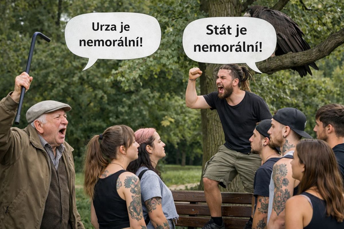 Důchodce Marian Dolejší ke svému překvapení narazil v pražském parku na potížistu Brejchu z Plzně, tvrdícího, že je anarchokapitalista Urza, a to se mu vůbec nelíbí. Má sice hůl, ale stojí za to riskovat ideologický spor s tolika lidmi najednou?