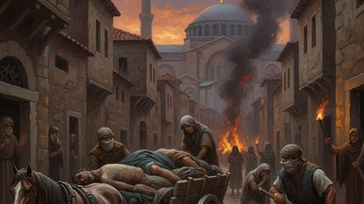 Epidemie začala v egyptském přístavu Palucium, odkud se šířila po obchodních cestách až do Konstantinopole. Tam v nejhorších dnech umíralo až 5 000 lidí denně. Město se dusilo v zápachu mrtvol, práce ustala a i císař Justinián I. sám nemoc prodělal – s obtížemi přežil, ale jeho říše už nikdy nezískala původní sílu.