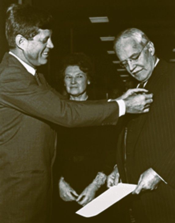 Kennedy se nuceně usmívá, ale pro Dullese bylo udělení Medaile národní bezpečnosti jen chabou útěchou za ponižující vyhazov