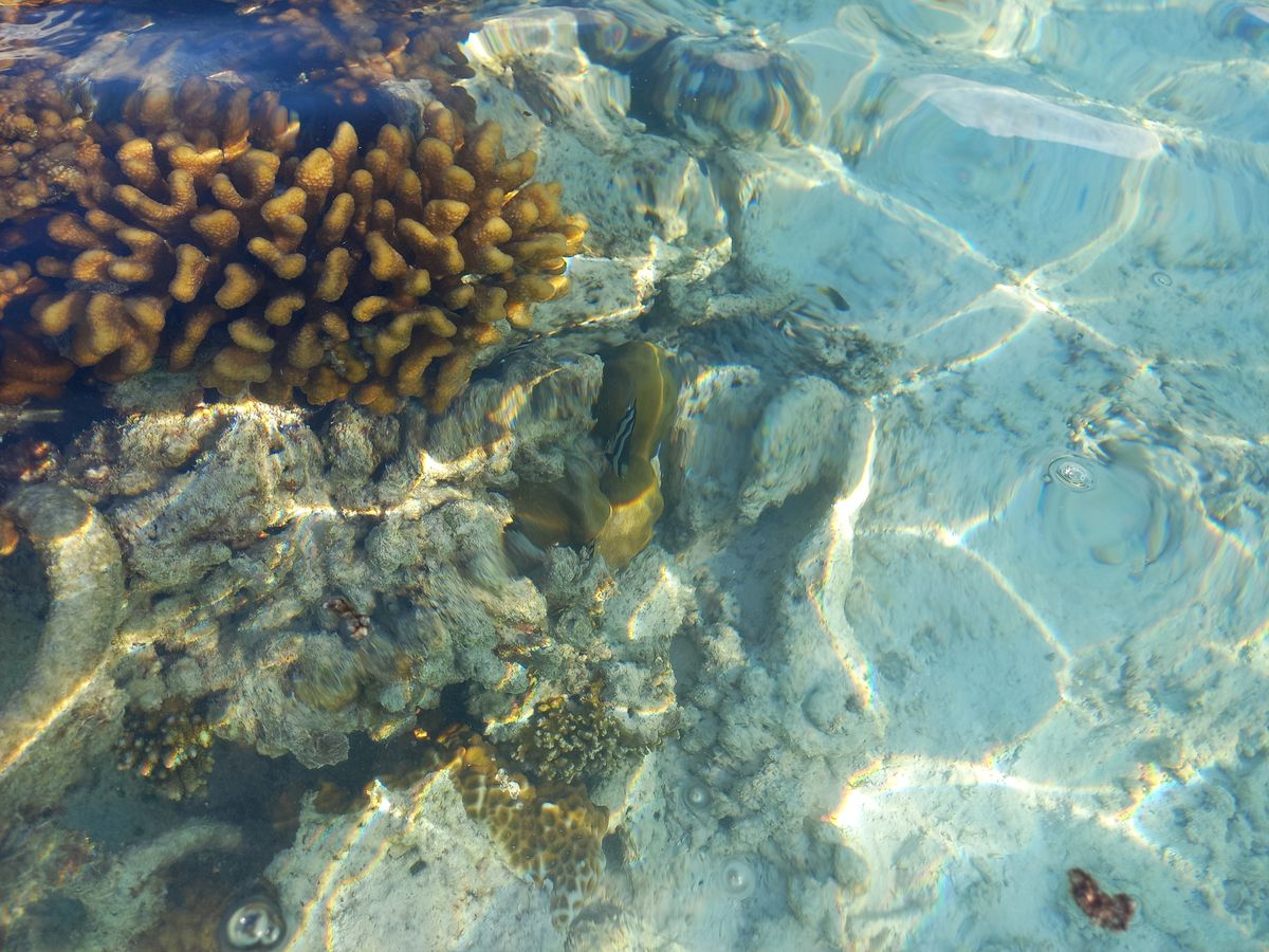 Kromě lenošení bylo na programu dne samozřejmě také koupání v neskutečně azurově modrém moři (barva předčila všechny katalogy světa). Teplota vody byla příjemná, takže kdyby se nám chtělo, vydrželi bychom se cachtat celý den. V plánu bylo i šnorchlování. I když jsme vybavení s sebou vzali jen pro jistotu, aby nám to pak třeba nebylo líto, využili jsme ho na maximum. Hrozně nás to chytlo, pozorování pestrého života kolem různobarevných korálů bylo skvělou zábavou. Viděli jsme snad všechny druhy ryb, teda kromě Nema, ten se asi pořád hledá. První zkušenost nebyla úplně příjemná. Manžela hned pokousala ryba. Byl to Picasso (ne ten malíř, tak se jmenuje ta ryba). Ale je pravda, že to byla naše chyba. Nadšení tím podvodním královstvím jsme tu rybu okukovali, ukazovali jsme si na ní, pronásledovali jsme ji, když nám chtěla uplavat. Prostě jsme ji obtěžovali, tak nám dala najevo, kdo je tady pánem. Po této lekci jsme si uvědomili, že jsme tu jen nezvaní hosté a podle toho se také musíme chovat! S respektem a pokorou, snažit se nenarušit život obyvatel světa pod mořskou hladinou. Od té doby už k žádnému incidentu nedošlo, i když manžel málem šlápl na místní druh rejnoka, který se na mělčině zahrabával do písku a chystal se k odpočinku. Prý nejsou místní predátoři nebezpeční a k útokům na člověka nedochází. Tak budeme těmto statistikám věřit.