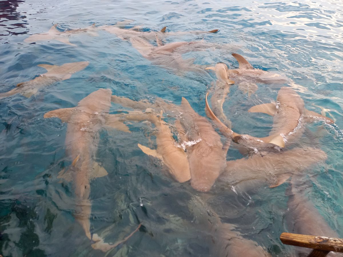 A naše nejoblíbenější akční aktivita bylo každodenní krmení dravé zvěře. Každý den vpodvečer tu probíhalo krmení žraloků, mant a jiných ryb a mořských oblud. Místní mořská havěť je tu téměř ochočená, žere skoro z ruky a dokonce bylo možné si ji i pohladit. Pro kousek žvance byli žraloci ochotni vyskočit až na schůdky a zašprajcovat se tam tak, že nemohli zpátky do vody.