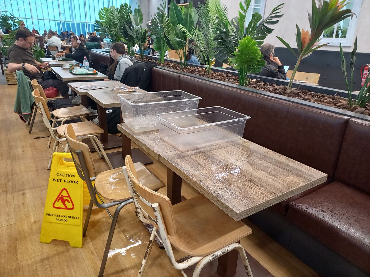 Do letištní haly začala střechou prosakovat voda. Hodně vody. Postupně se zužovaly použitelné prostory.