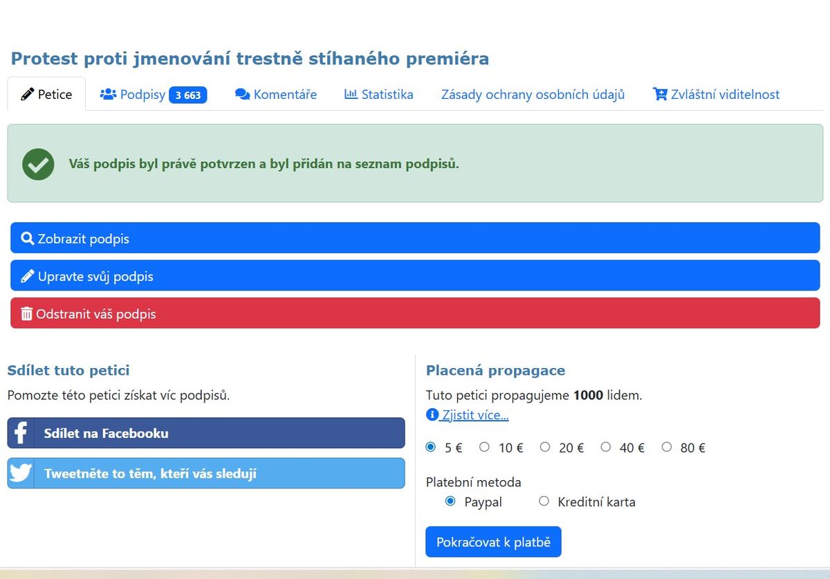 Celá petice i s možností podpisu je prezentována na webu Protest proti jmenování trestně stíhaného premiéra - Petice.com. Právě, kdy píši tento článek, je podpisů pod peticí 3751 a doufám, že budou přibývat a dají najevo nesouhlas se současný stavem. Je tady mnoho důvodů pro rozhodný protest.