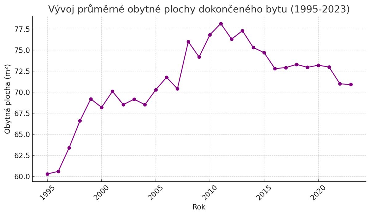 Dalším zajímavým aspektem je změna průměrné obytné plochy dokončeného bytu. V roce 1995 byla průměrná velikost bytu přibližně 60 m², zatímco v roce 2023 dosahovala téměř 71 m².