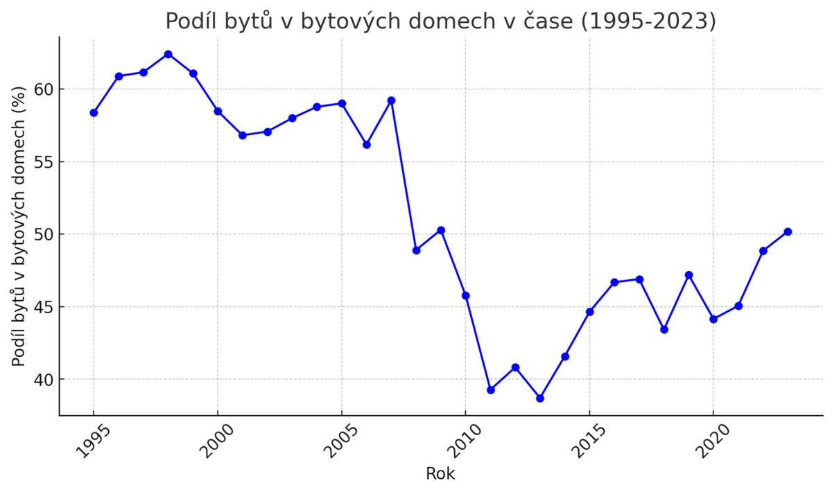 Od roku 1995 do roku 2023 došlo v ČR k několika výkyvům v počtu dokončených bytů. Zatímco v 90. letech se počet pohyboval kolem 13–22 tisíc bytů ročně, po ekonomické krizi v roce 2009 opět začal klesal. Vrcholu dosáhl v roce 2022 kdy se dokončilo téměř 40 tisíc bytů. Průměrně se od roku 1995 do roku 2023 se dokončilo 29 tisíc bytových jednotek v rodinných a bytových domech.