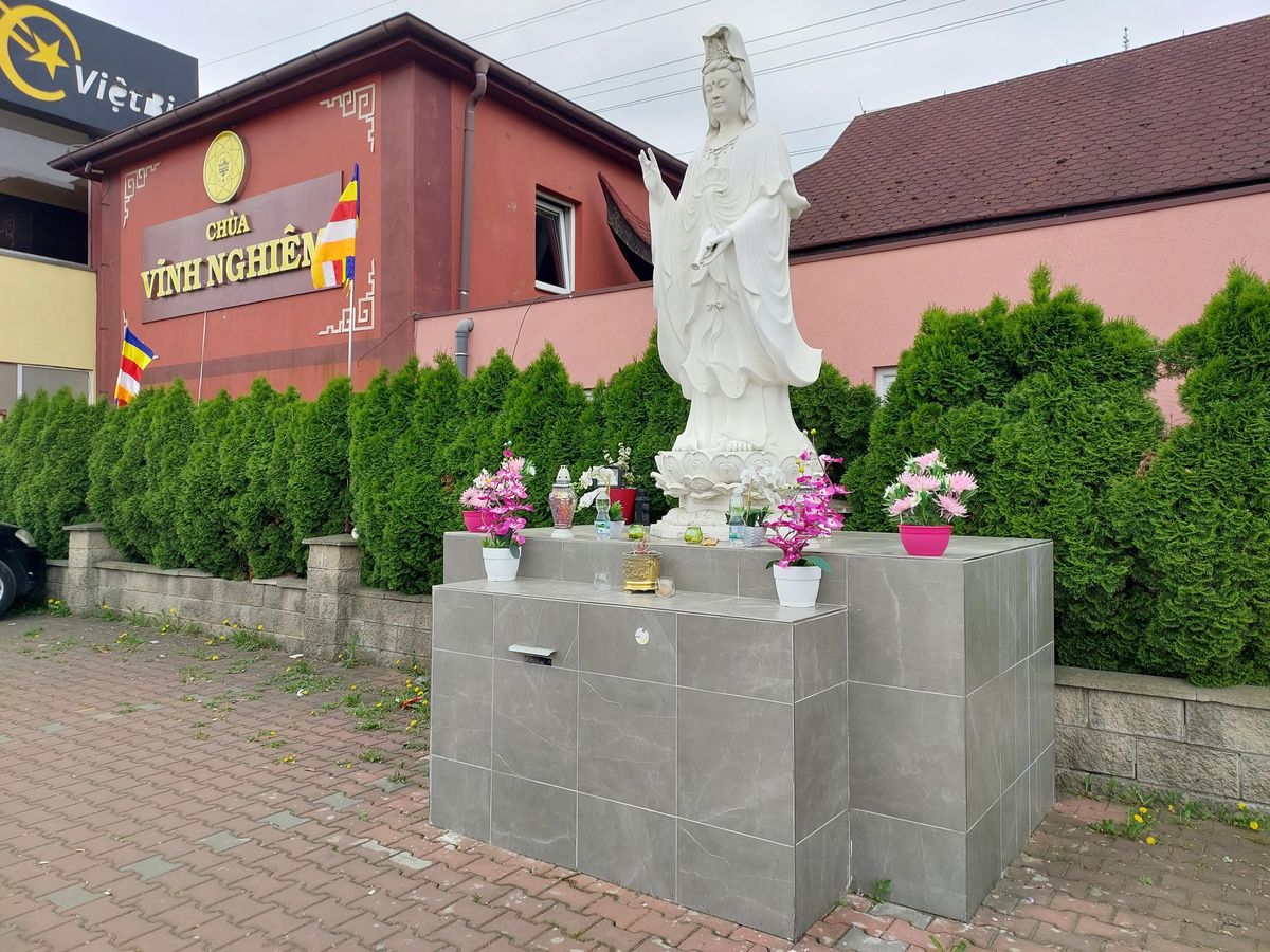 Socha bohyně stojící před buddhistickým chrámem v Sapě.