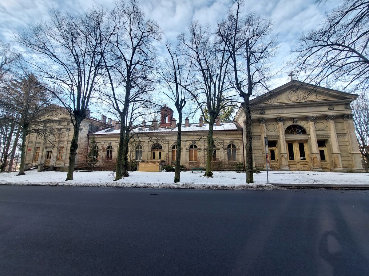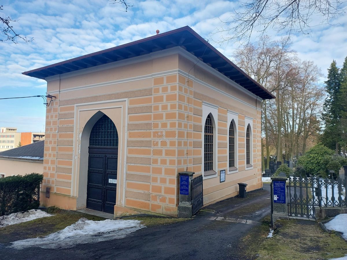 Hned naproti stále ještě stojí rozsáhlá křesťanská smuteční síň, která byla doplněna o potřebné technické zázemí. Na první pohled si zaslouží rozsáhlejší opravu, ale otázkou asi zůstává její další využití. Až později nám při pohledu na mapu došlo, že židovská a sousední evangelická část je jen dílčím výsekem daleko většího městského hřbitova.