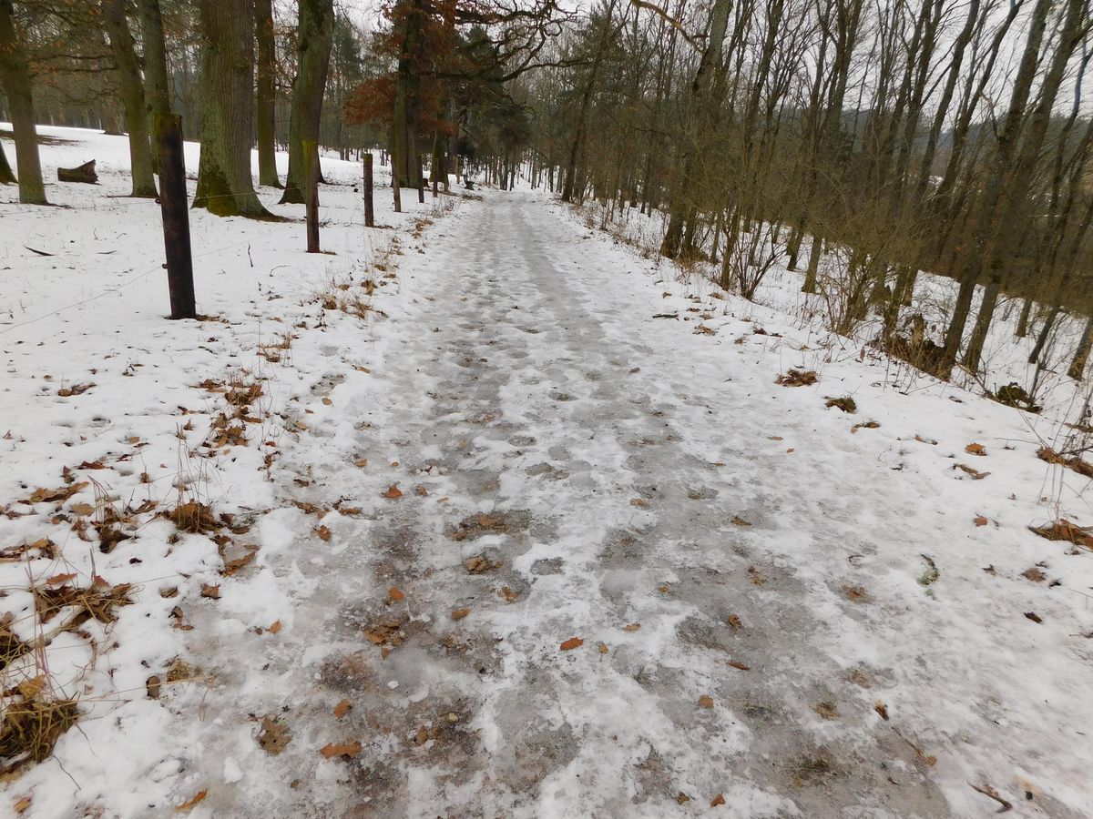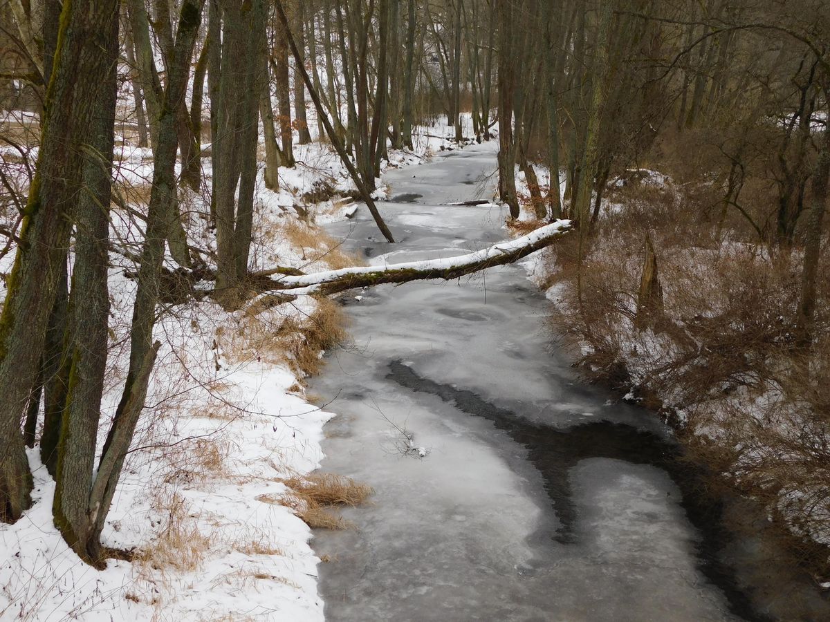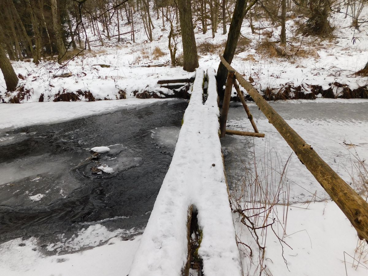 Od mlýna jsem pokračoval po červené zpět k hradu a parkovišti. Zdejší příroda je krásná i v zimě a z místních informačních cedulí se dozvíte, že je bohatá na množství zvířat, a to jak suchozemských, tak potočních a říčních. Procházka je tu celkem pohodlná a měří asi 7 km. Některá místa jsem ale zdolával s velkou opatrností, například lávka přes Úterský potok na žluté stezce pod kostelem sv. Barbory je opravdu dobrodružná a chvílemi jsem přemýšlel, jestli raději nepřejít přes zamrzlý potok.