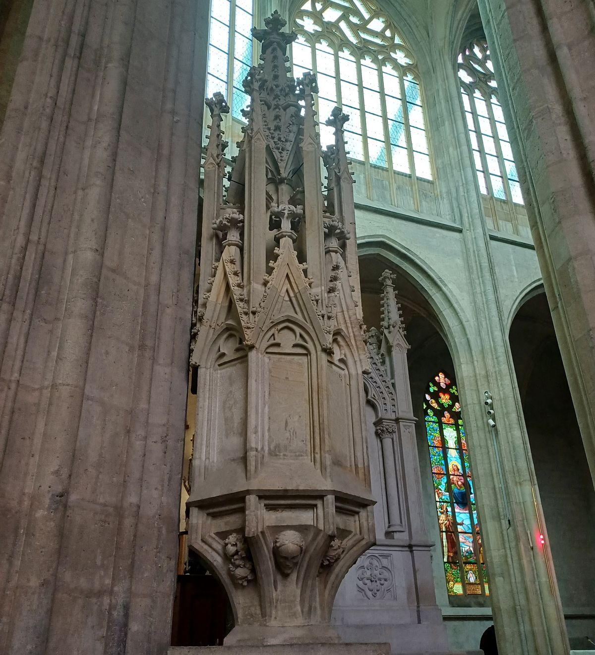 Presbytář je z vnější strany zakončen devíti stranami osmnácti úhelníku, na západní straně k němu přiléhají dvě pole rovnoběžná s lodí. Střídají se zde plné stěny a stěny s širokými čtyřdílnými okny s kružbami. Nároží jsou ozdobena fiálami a dvoj bokými pilířky, mezi nimiž je kamenné zábradlí. Tato nižší část obsahuje šest trojbokých kaplí, sakristii a dekorativně klenutý ochoz.