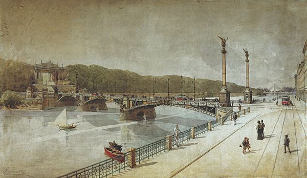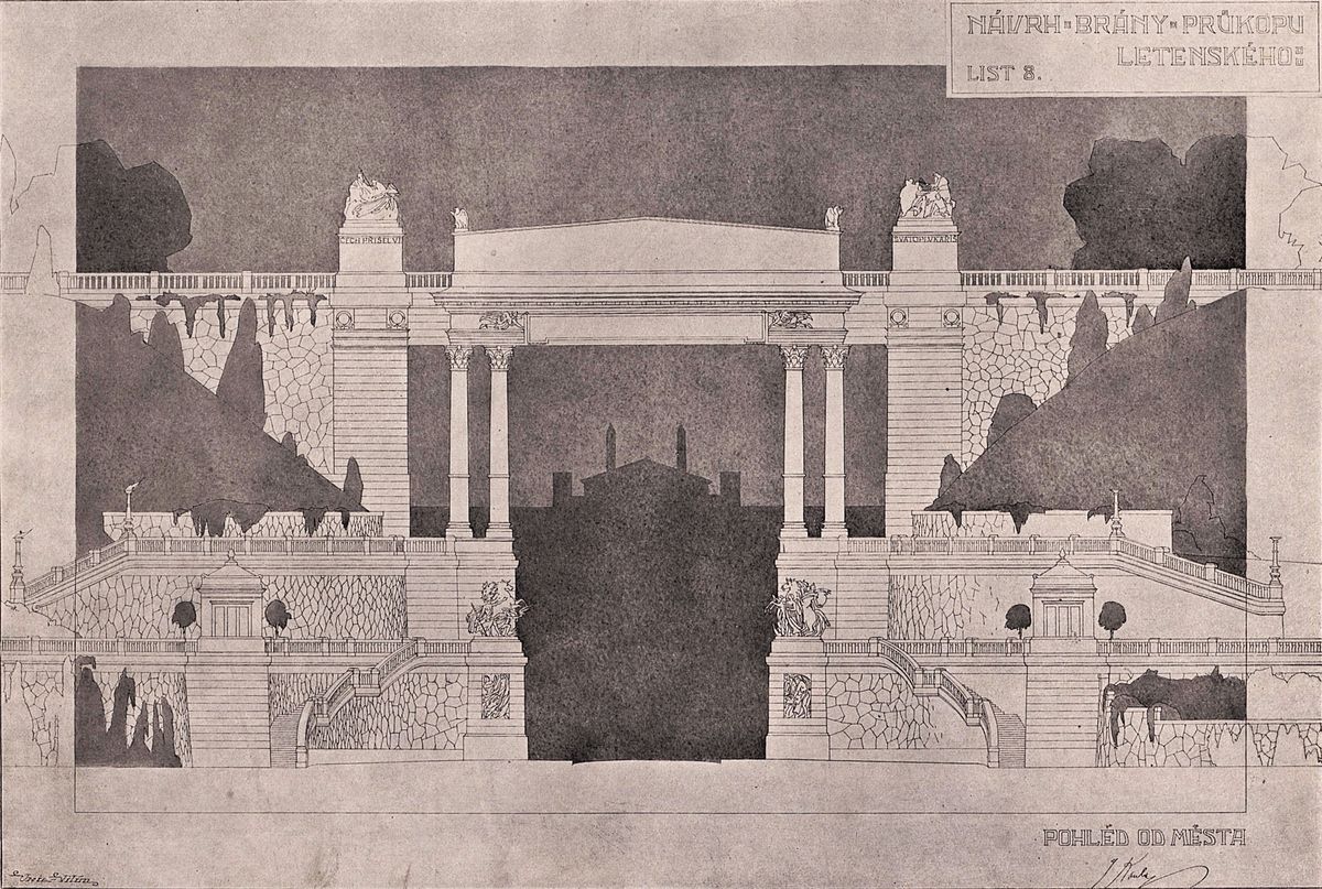 V jeho představě se ústí průkopu mělo proměnit v architektonický motiv brány nebo přemostění – nikoli okrasu, ale významové gesto. Brána měla být point de vue – závěr pohledu Mikulášské třídy (dnešní Pařížské), který by se u Čechova mostu otevřel do nové části města. Měla být symbolem vstupu, rozhraním dvou epoch.