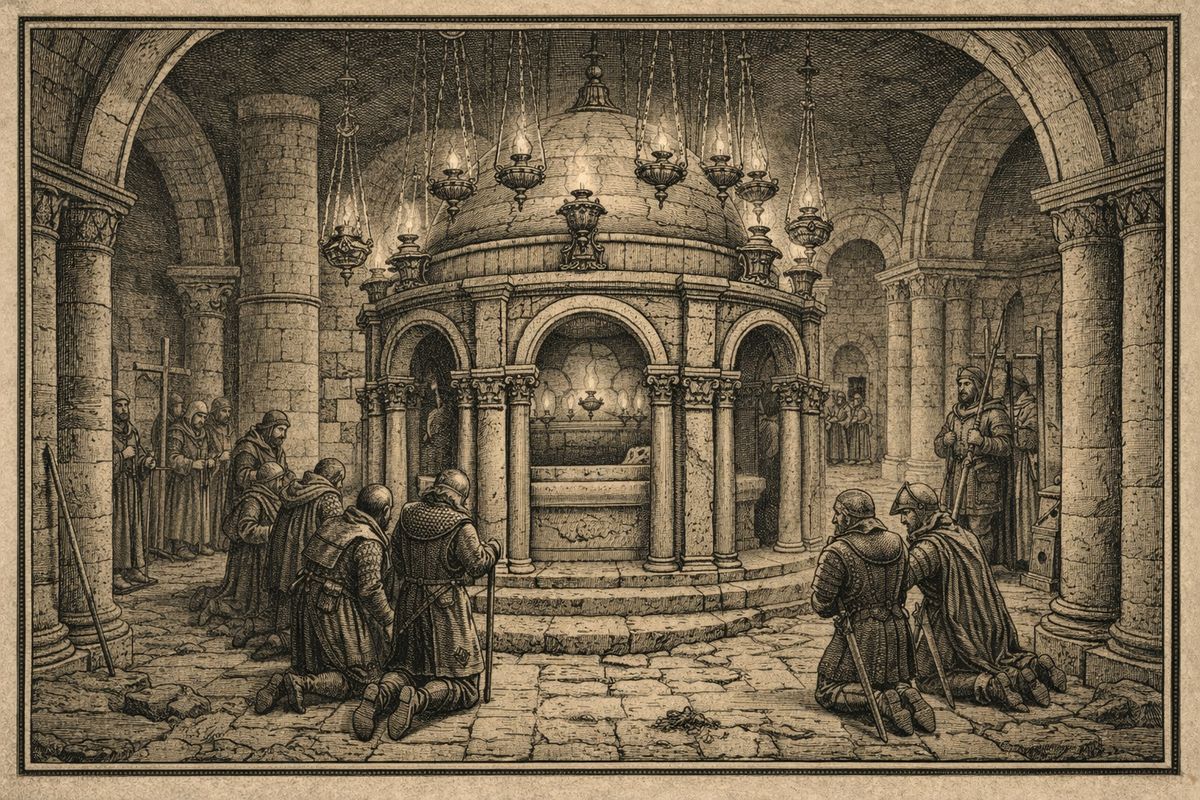 Po několika dnech v Jeruzalémě se konečně dočkali a mohli vidět Boží hrob. Asi dvě hodiny před večerem byli poutníci vyzváni, aby se připravili k návštěvě chrámu Božího hrobu. Před vstupem se na prostranství shromáždil zástup lidí – pohanů, mužů i žen, a také křesťanů jiných vyznání. U chrámových dveří seděl písař Abrahim s mameluky a spolu s patronem výpravy vpouštěli poutníky dovnitř, přičemž každého jmenovitě zapisovali. Jakmile všichni vstoupili, byly za nimi dveře uzamčeny.
