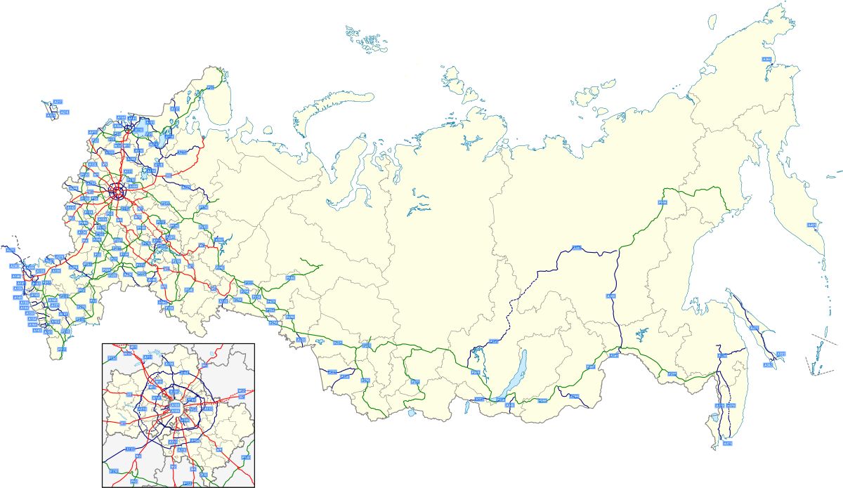 Mapa ruských federálních dálnic s výřezem Moskevské oblasti