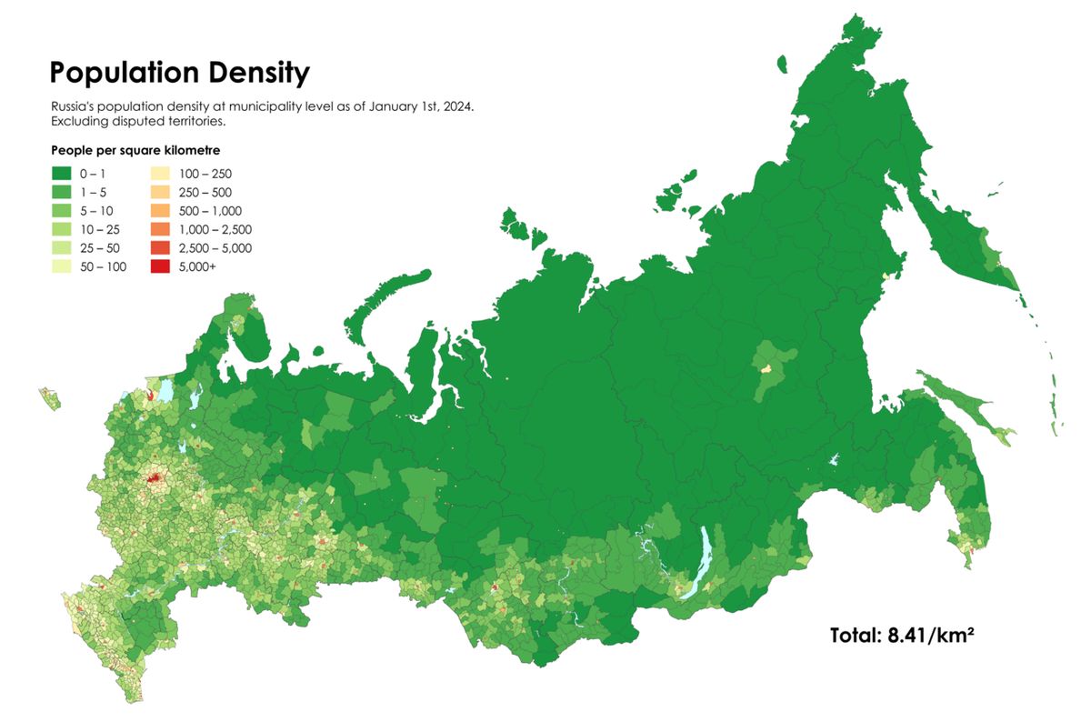 Ještě zásadnější je však hustota obyvatelstva. Rusko má průměrně jen asi 8–9 obyvatel na km², což je jedna z nejnižších hodnot na světě.