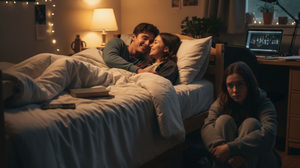 Když Mirka dorazila k nám na pokoj, Adam zářil tak moc, že by mohl nahradit i ty nefunkční zářivky na chodbě. Atmosféra byla… no, řekněme specifická. Začalo to klasicky: společné odkládání svršků, trocha té rozpačité konverzace a pak první polibky.