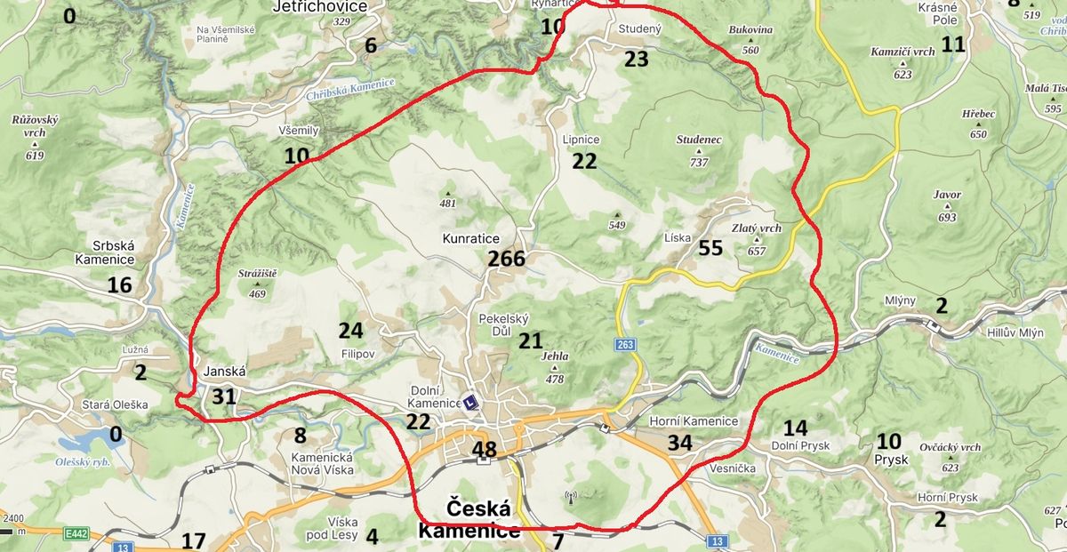 Na začátku článku jsem umístil mapu severních Čech. Nyní si ji trochu přiblížíme a na okolních obcích si ukážeme, odkud ženichové kunratických nevěst pocházeli.